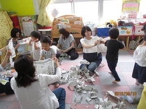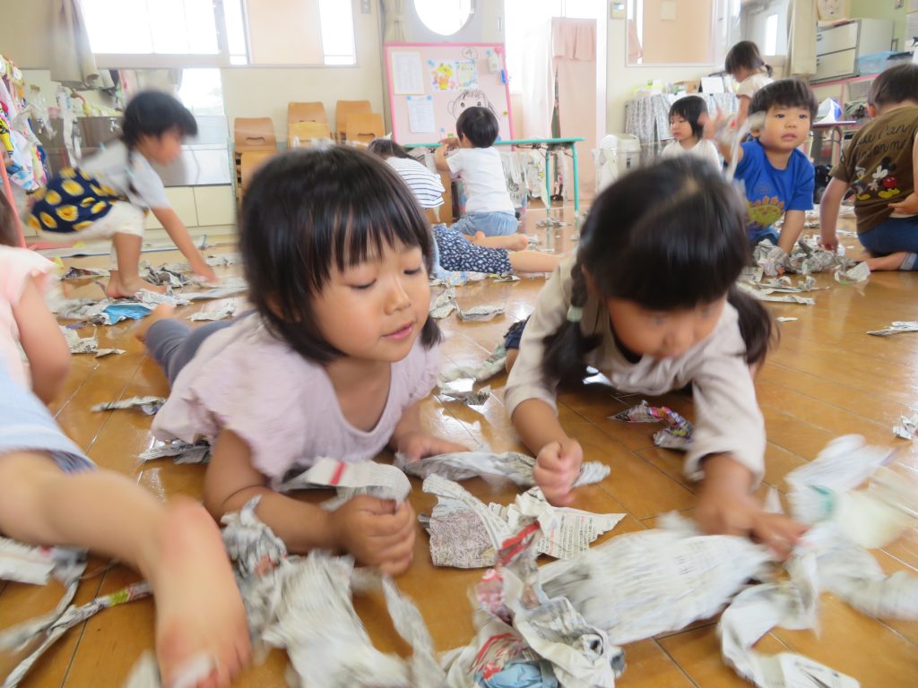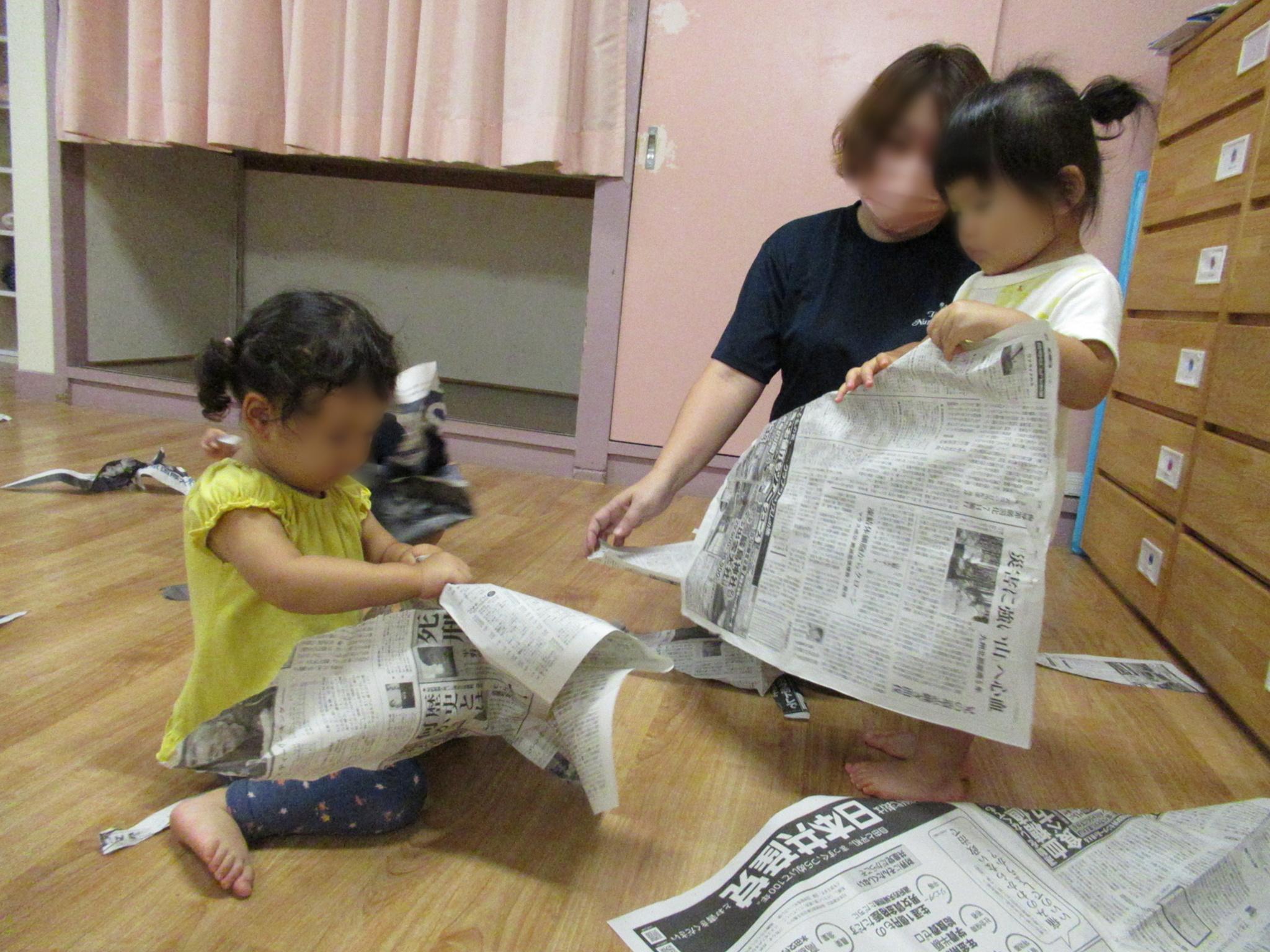 新聞紙遊び すみれ 1歳児第二椎の実子供の家。