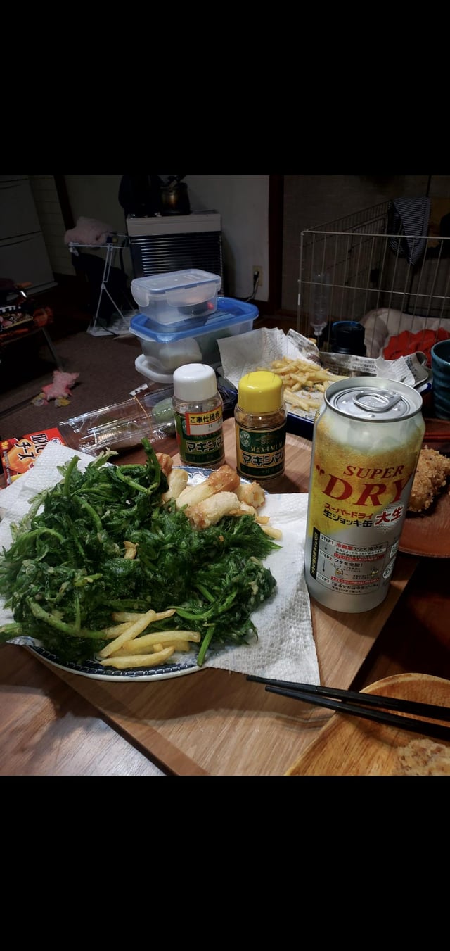 春、旬の野草天ぷら♡ ヨモギ、ユキノシタ、タラの芽❣️ 全部我らのアジト スタジオ の庭でとれるのだ! 素晴らしいありがたい嬉しい美味しい✨息子もバクバク^_^ 竹の子も獲れた!けどまだあく抜きこれから〜。明日楽しみ〜♪庭で獲れた野草旬のもの天ぷらしか。